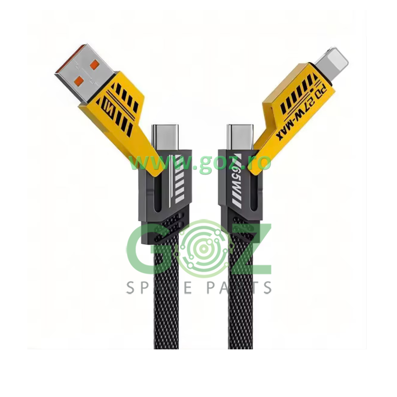 🔋 Cablu Universal 4 în 1 USB-A/Type-C/Lightning 65W/27W – soluția perfectă pentru încărcarea și transferul de date între multiple dispozitive. Cu suport pentru încărcare rapidă de până la 65W (USB-C) și 27W (Lightning), acest cablu îți oferă compatibilitate extinsă cu telefoane, tablete, laptopuri și alte dispozitive. Designul său multifuncțional îl face ideal pentru utilizarea zilnică, acasă, la birou sau în călătorii.